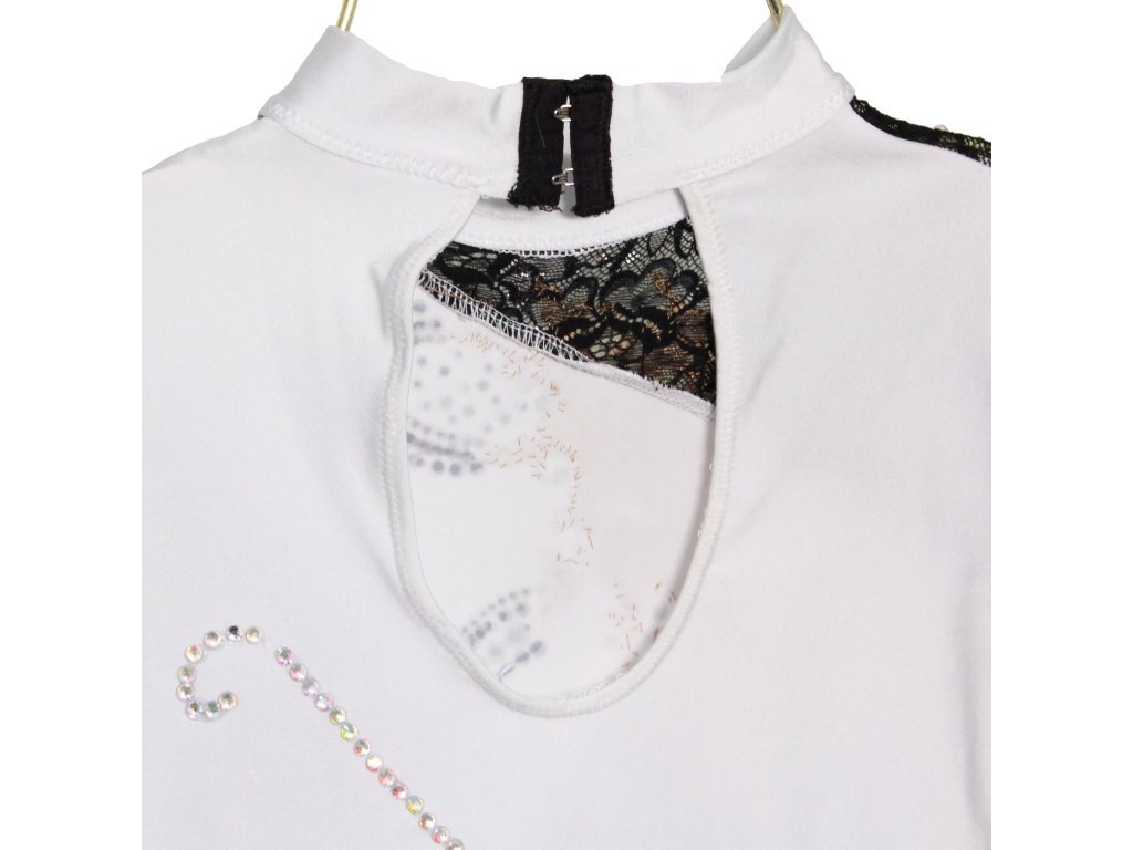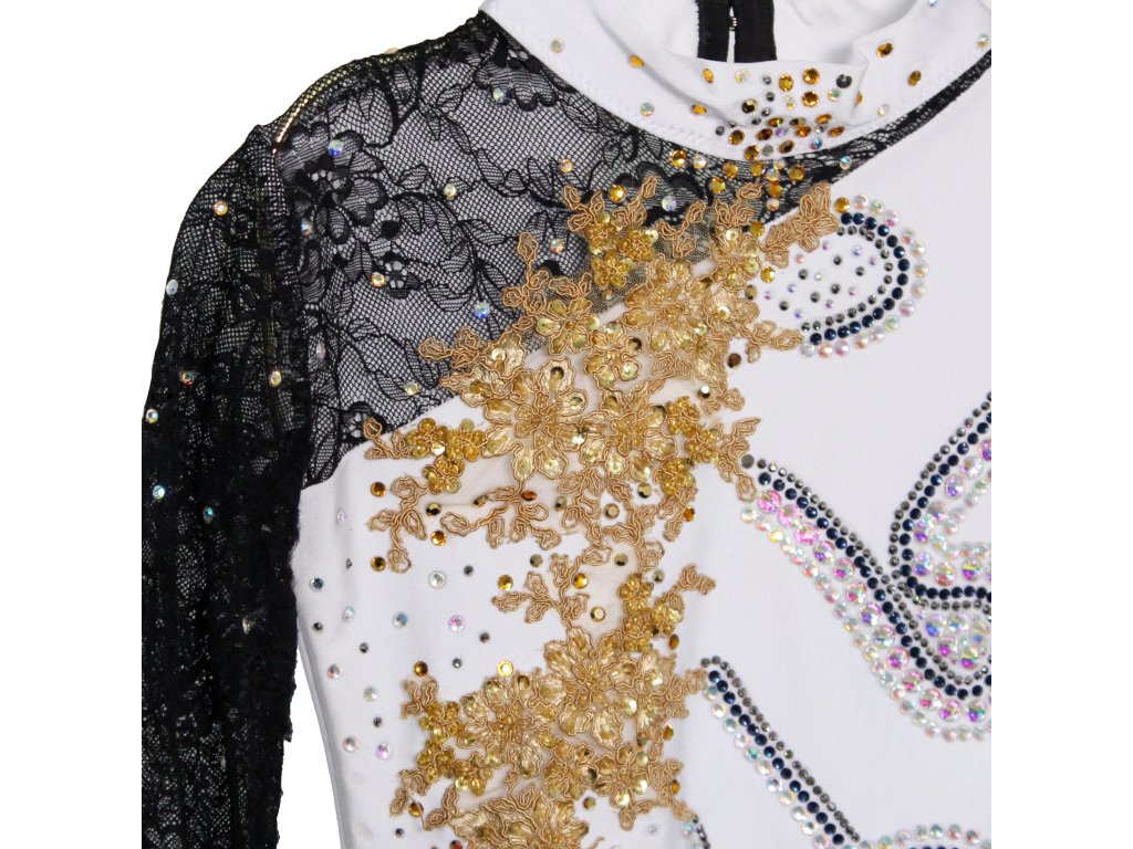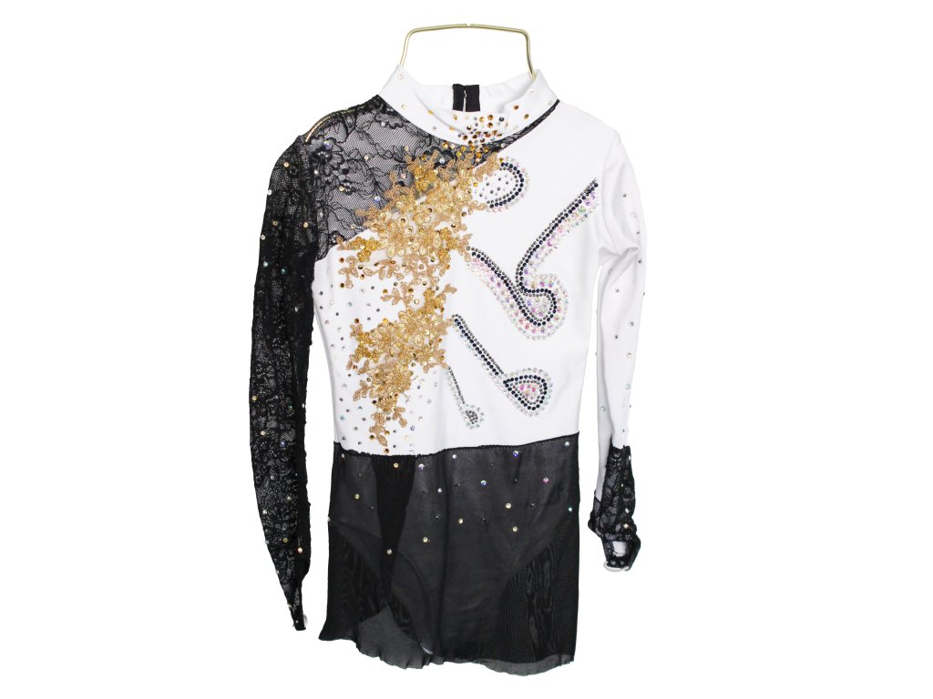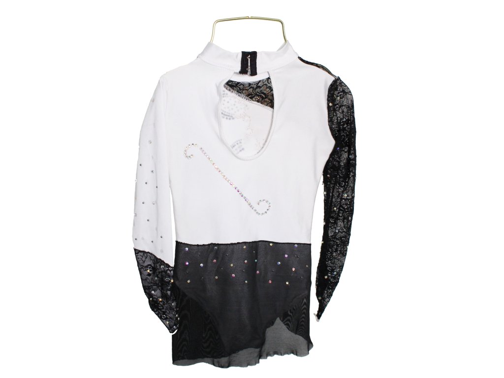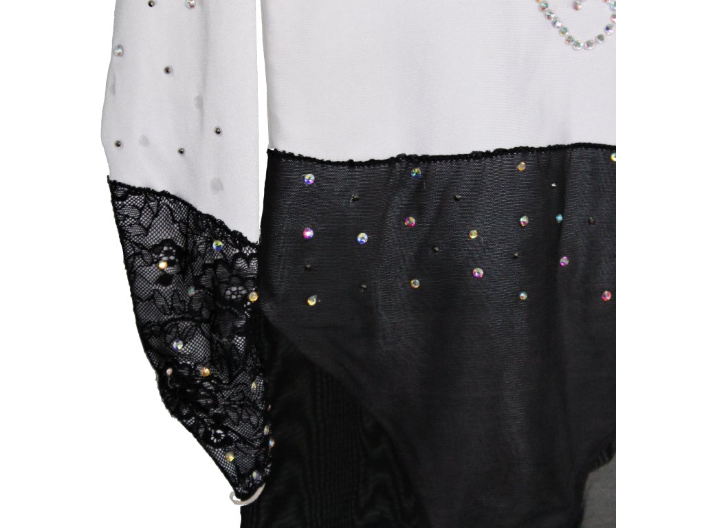 Elegantní dětský soutěžní dres, zdobený třpytivými kamínky a klasickou sukénkou, která má nenápadný rozparek na pravém boku. Vhodné pro velikost cca vel. 134.