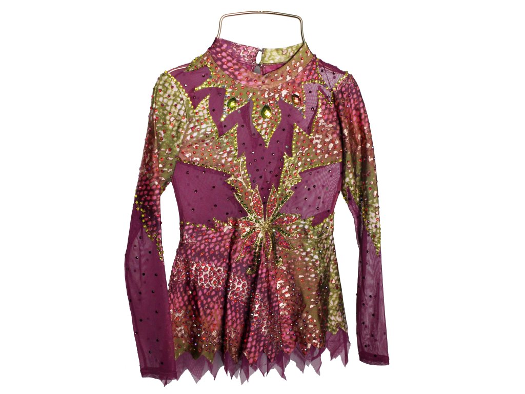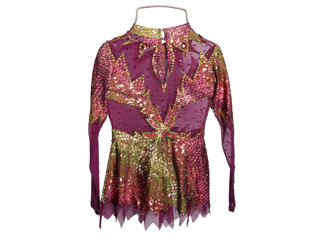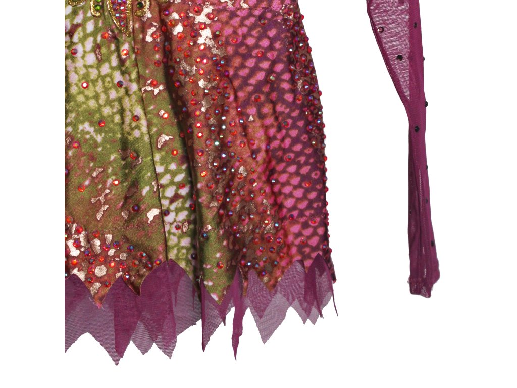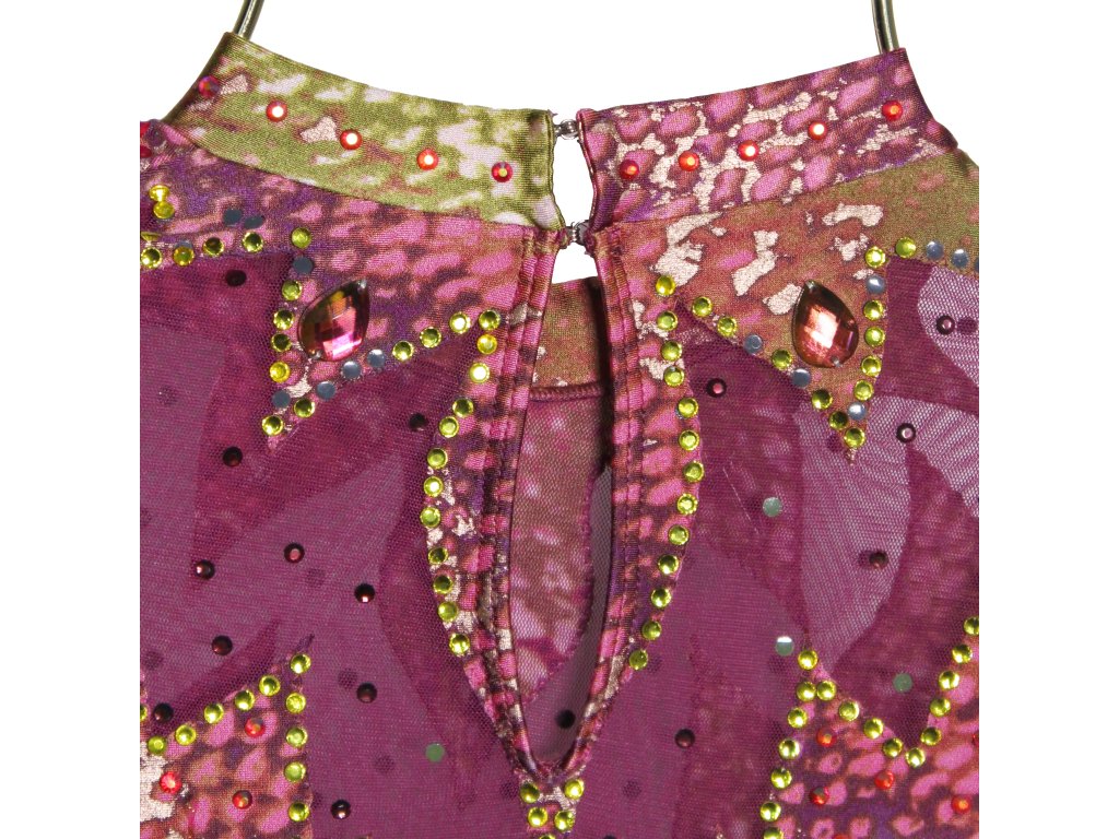 Originální dětský soutěžní dres v atraktivním fialovém provedení s látkou napodobující hadí kůži. Bohatě zdobený pro maximální efekt na soutěžním pódiu, vhodný zejména pro moderní gymnastiku nejmenších gymnastek.
