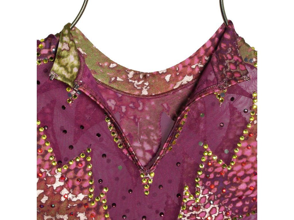 Fialový dětský soutěžní dres (vel. 116/120) s hadím vzorem a bohatým zdobením. Skvělý stav, ideální pro moderní gymnastiku nejmenších závodnic.