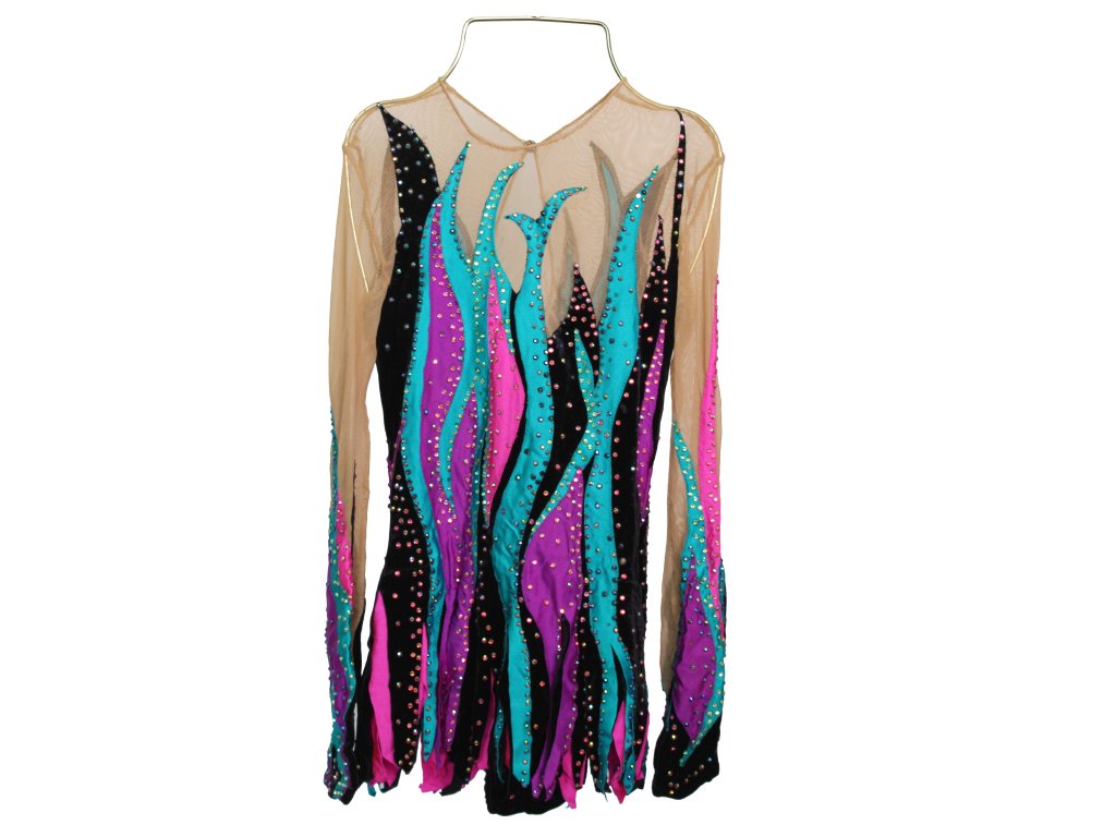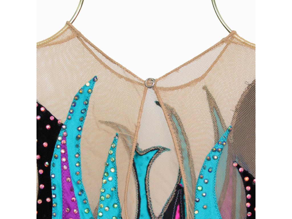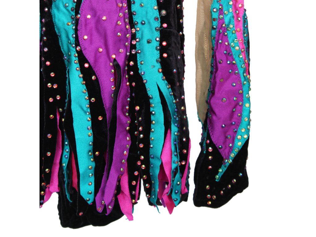 Soutěžní dres bohatě zdobený krystaly a spoustou barev. Vhodný pro velikost cca 140/146.
